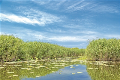 蓝天白云下的芦苇荡。 图片来源:视觉中国